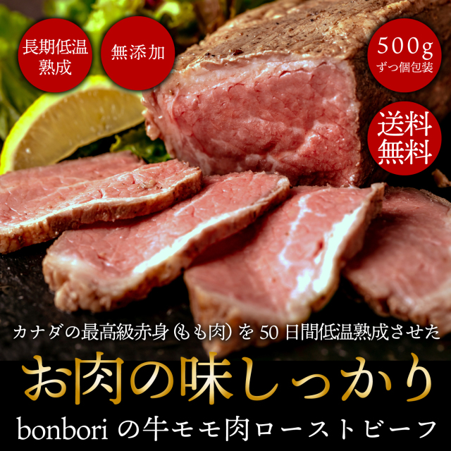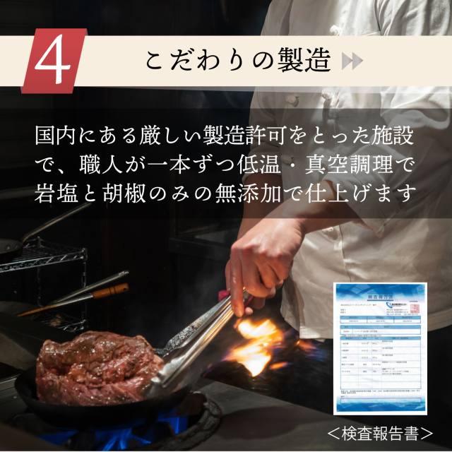 50日間じっくり時間をかけて熟成させた後、職人が1本1本丁寧に作り上げた逸品です。厳格な管理の工場にて、添加物を使わず、天然の岩塩と黒胡椒のみで味付けをして調理しているので、お子様にも安全安心なローストビーフです。