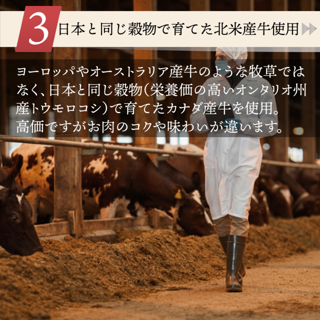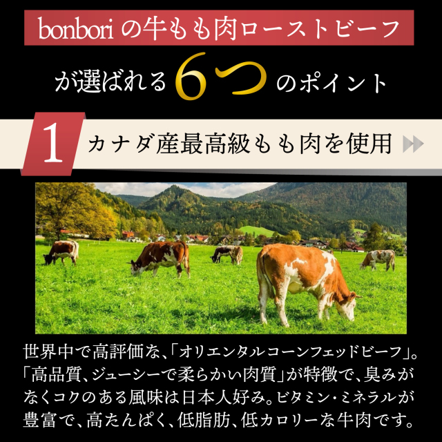 栄養価が高いトウモロコシで肥育された、世界中で評価が高いオンタリオコーンフェッドビーフのもも肉で作ったローストビーフです。日本人が好きな臭みがなくコクのある風味が特徴です。ビタミンミネラルが豊富で高たんぱく、低脂肪、低カロリーな牛肉です。