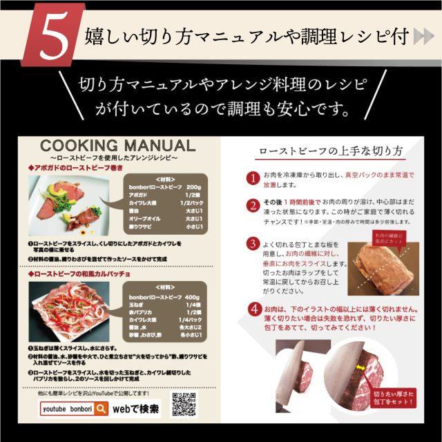 ソースとレホールが付いているので、解凍して切るだけで、御馳走が完成します。様々なアレンジも可能で、ご飯に乗せてローストビーフ丼、パンに挟んでローストビーフサンド、スライスしてソースをかけて簡単オードブル、等々色々楽しむ事が出来るローストビーフです♪